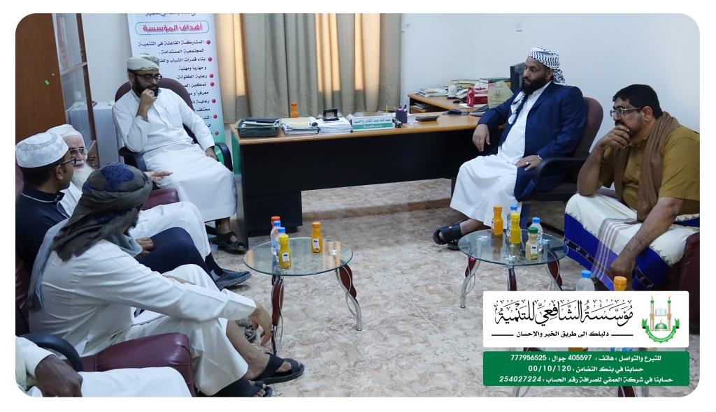 السبت 4 جمادى الآخرة 1440هـ 9-2-2019ماستقبل رئيس مؤسسة الشافعي للتنمية الشيخ / عبدالله عبدالقادر باحميد والأستاذ / محمد فؤاد بلفاس نائب المدير التنفيذي بالمؤسسة ظهر يوم أمس الأحد 27 يناير 2019م وكيل قطاع الإرشاد بوزارة الأوقاف الشيخ / محمد عيضة شبيبة حيث اطلع على نشاط المؤسسة وما تقوم به من خدمة في مجال للأعمال الخيرية والتعليمية والاغاثية في جميع محافظات الجمهورية .