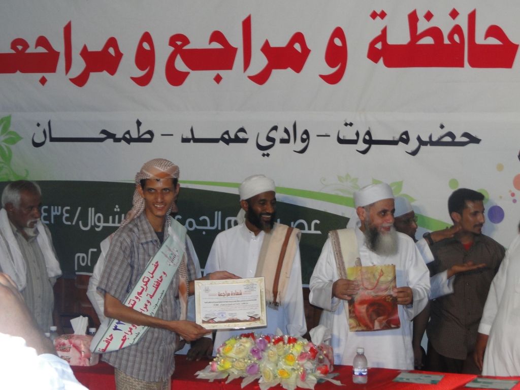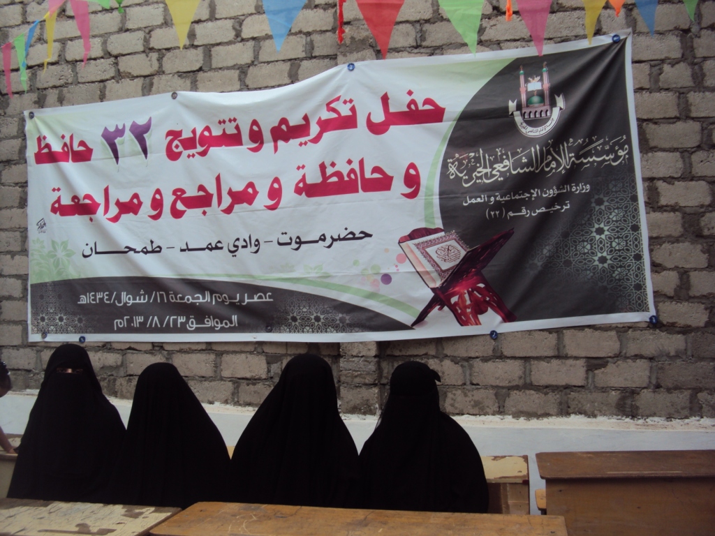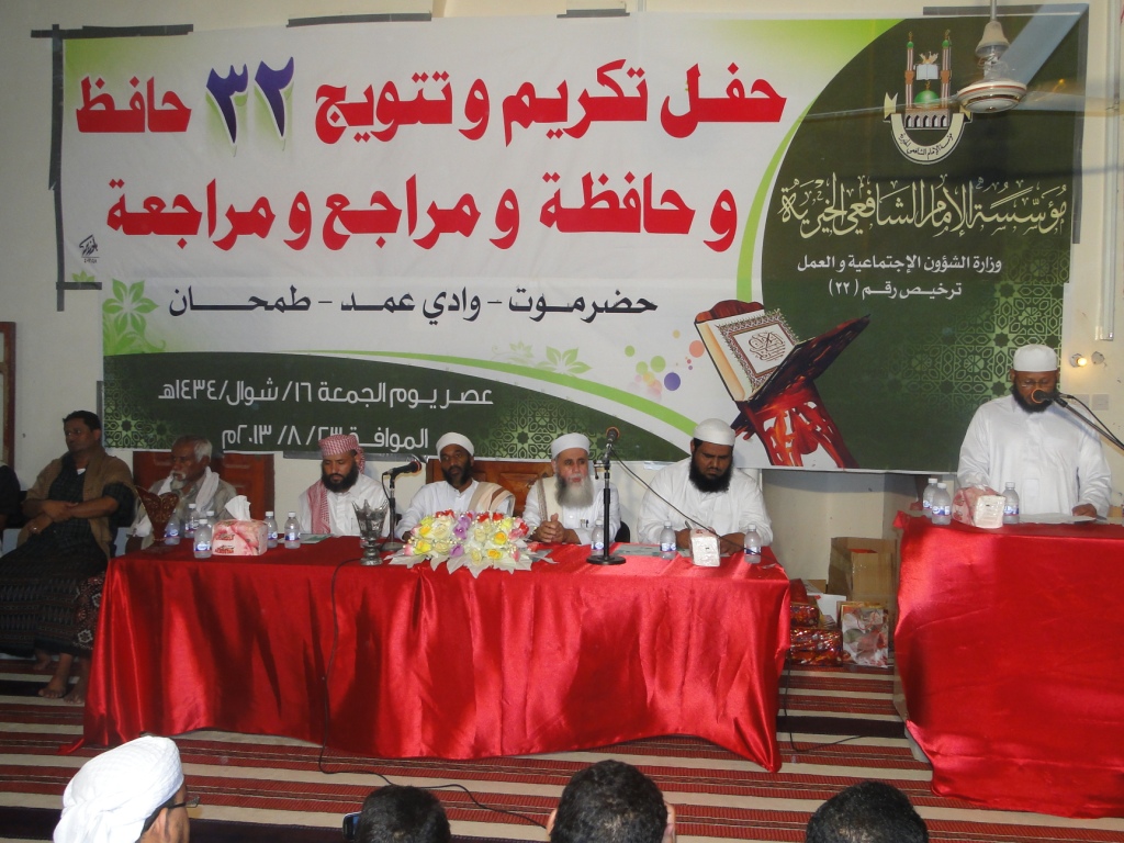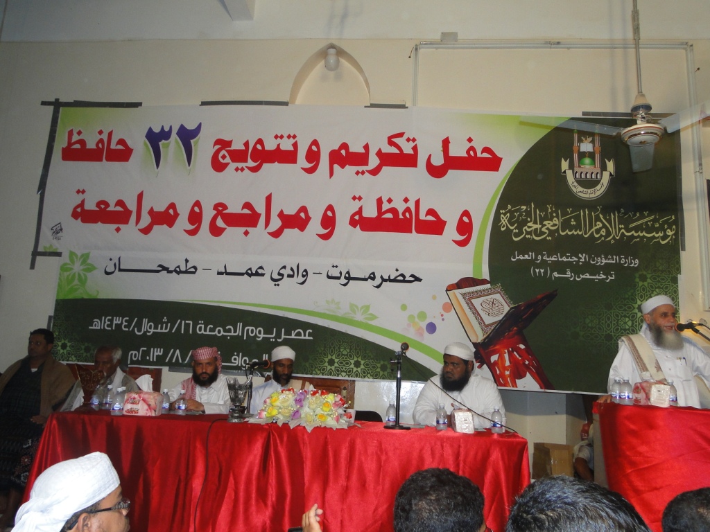 في حفل بهيج أقامت مؤسسة الإمام الشافعي الخيرية حفل تتويج 32 حافظ وحافظة ومراجع ومراجعة وذلك عصر يوم الجمعة 16 / 10 / 1434هـ الموافق 23 / 8 / 2013م بوادي عمد منطقة طمحان .