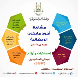 ومن ضمن المشاريع التي نفذتها المؤسسة خلال شهر رمضان ضمن ذات المشروع (أجود مايكون) مشروع الأفطارات الرمضانية حيث أقيمت 8145 وجبة إفطار في مختلف مناطق *الوادي* ، وأيضا تنفيذ مشروع السله الغذئية حيث تم توزيع 78 طن من المواد الغذائية على 1604 أسرة من الفقراء والأيتام والأرامل والمرضى والمحتاجين وكذا توزيع أكثر من 25 طن من التمور استفاد منه اكثر من 17.185 أسره .